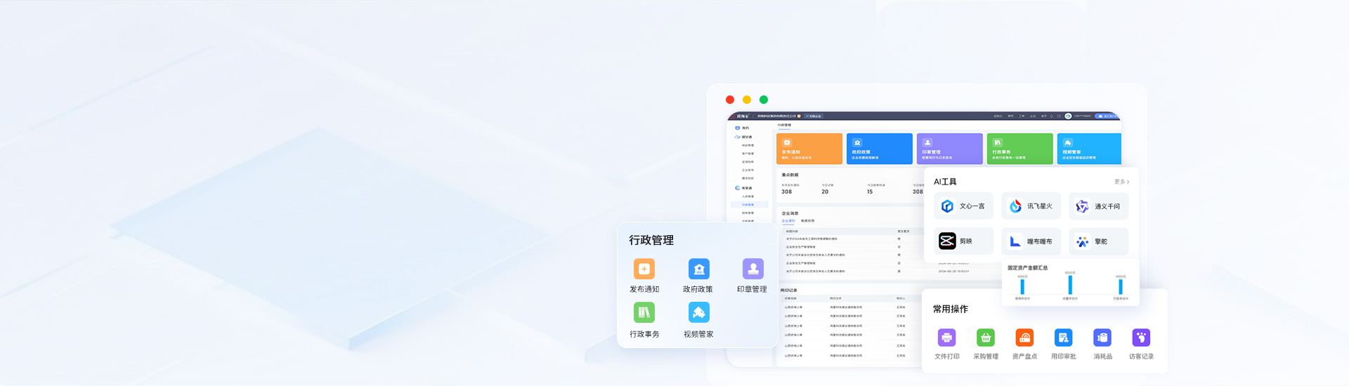 覆蓋企業行政辦公全場景,包含來訪來電記錄、文件印刷、快遞郵寄、訪客記錄、資質證照管理等,通過智能化管理,解放行政人力,優化企業資源,助力企業行政辦公高效運轉。
